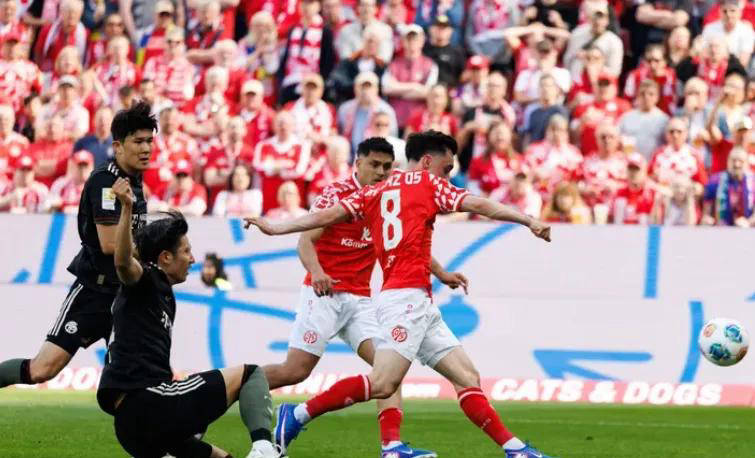 鉴于即将连续两场欧冠大战对阵巴黎圣日耳曼,主教练孔帕尼决定在德甲比赛中给部分主力球员休息。这场比赛开局第15分钟,美因茨的佐野海舟在右路送出精准传中,科尔劲射破门,拜仁客场0比1落后。第29分钟,美因茨在中场抢断成功发起极速反击,内布尔禁区内冷静补射得手,将比分扩大到0比2。上半场补时阶段,第47分钟,佐野海舟的一脚劲射击中横梁,贝克尔迅速跟进补射破门,比分变成0比3。此时,拜仁主帅乌尔比希面露无奈和尴尬。